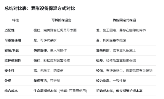 對于形狀不規(guī)則、需要頻繁維護或檢修的異形設備,使用可拆卸保溫套不是一種簡單的替代選擇,而是一種在保溫效率、維護便捷性、安全環(huán)保和長期經(jīng)濟效益上都具有壓倒性優(yōu)勢的現(xiàn)代化解決方案。它特別適用于石油化工、制藥、食品飲料、電力、新能源等對工藝溫度控制和設備維護要求高的行業(yè)。